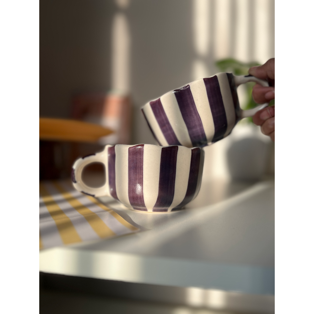 Rich blackcurrant stripes bring a deeper, moodier take to the playful Caprice pattern. Hand-painted in purple and cream with a softly scalloped rim and a chunky rounded shape, this mug is made for slow coffees, indulgent hot chocolate, and comforting bowls of soup. Its artisanal character and bold stripe detailing make it both a functional favourite and a beautiful collectible for anyone who loves charming, design-forward ceramics.