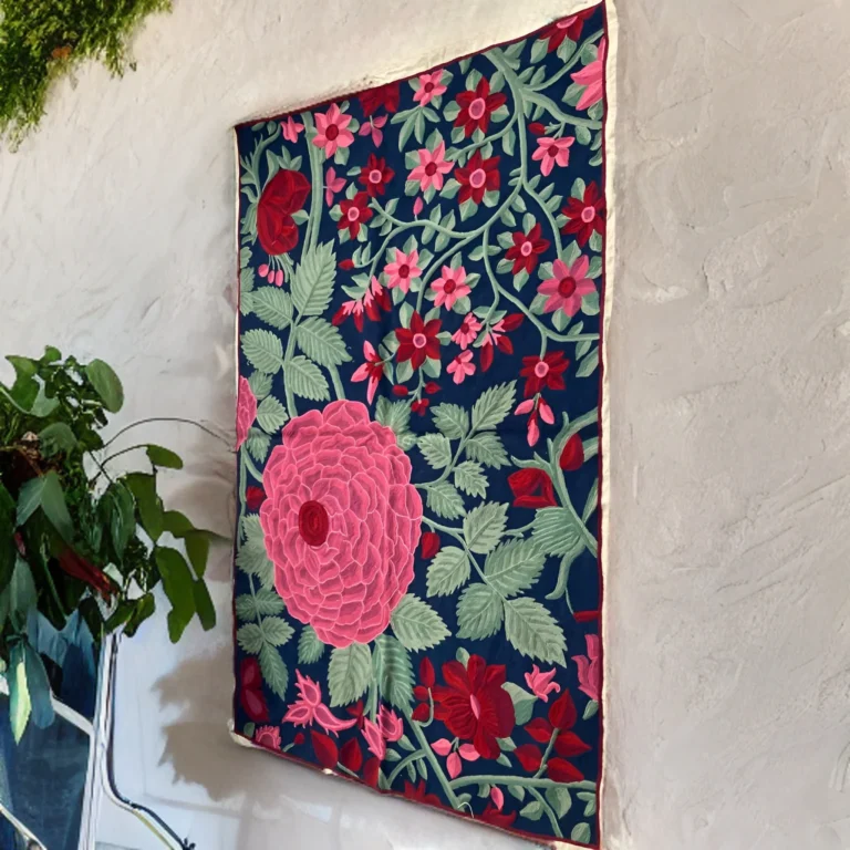 Keep your embroidered rug clean by gently vacuuming without a brush and spot cleaning with a mild detergent.