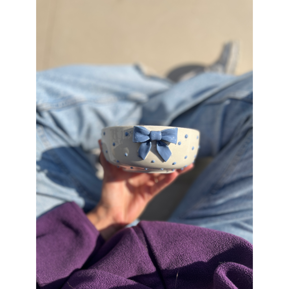 Charming with a cool-toned twist, the Blue Ribbon Bowl brings playful elegance to your everyday table. Crafted in ceramic with a glossy finish, this bowl features hand-painted blue raised 3D dot detailing across the surface, finished with a sculptural 3D ribbon bow for a statement touch. Sweet yet refined, it’s designed to be both decorative and practical for daily use.