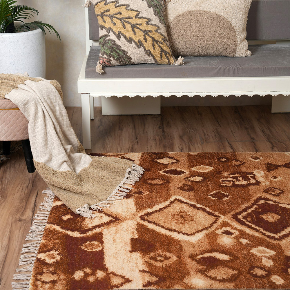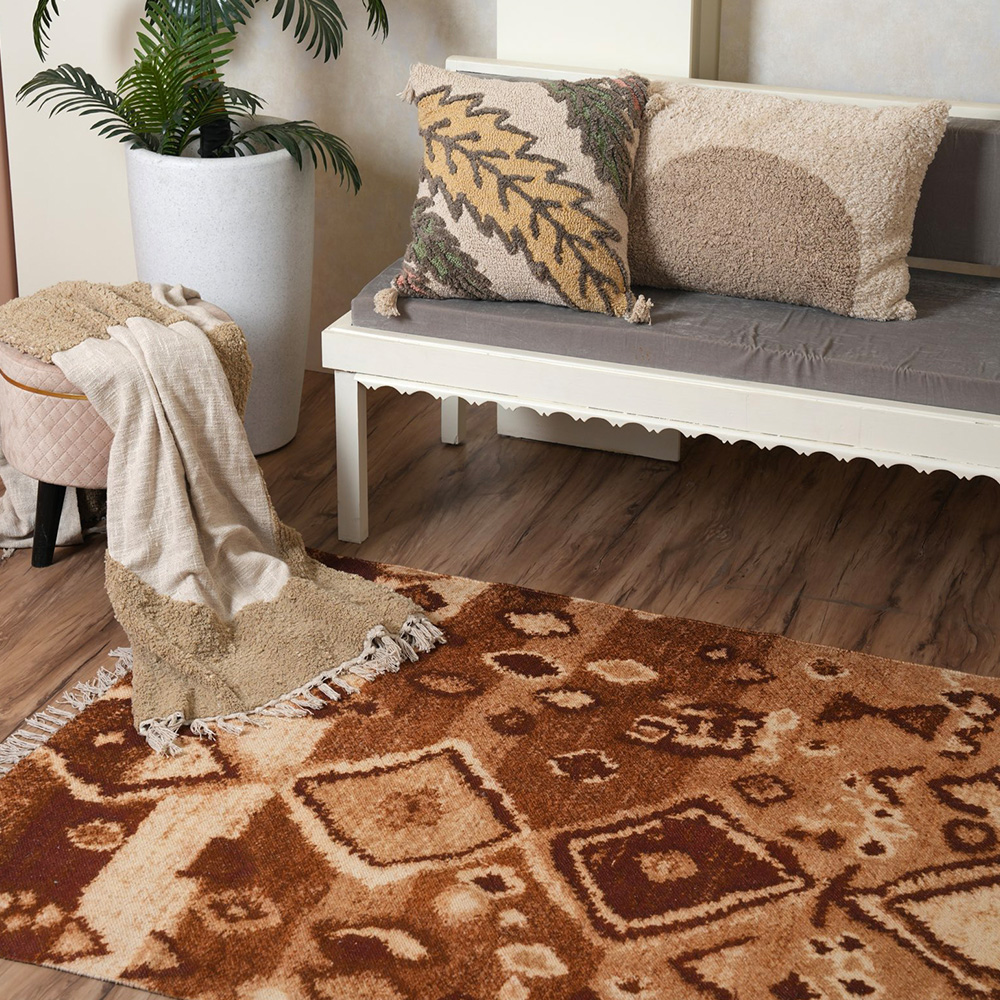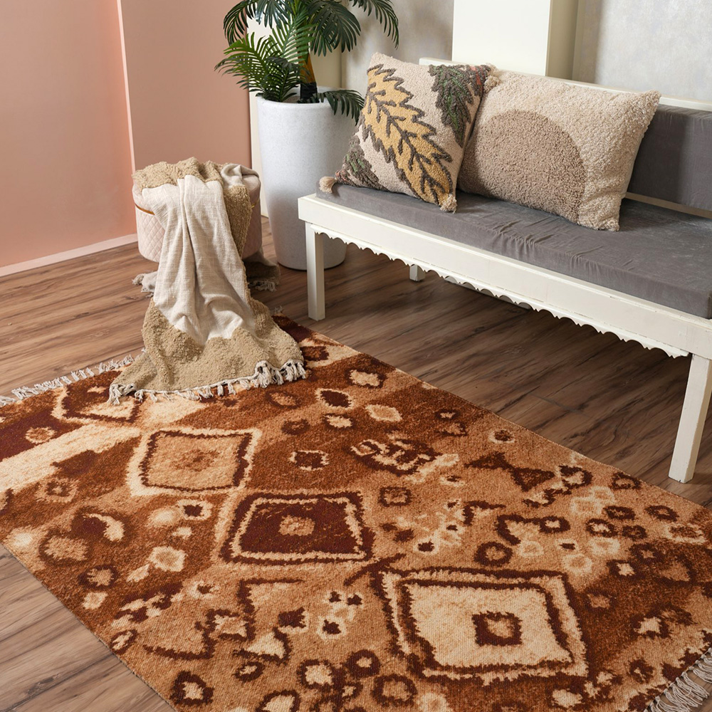 our rugs exude luxury and durability, promising a touch of sophistication to your living space. Embrace the timeless charm of brown and cream hues, beautifully woven to create a mesmerizing texture adorned with intricate diamond prints. Material: 100% Handloom Cotton Please note: All of our products are meticulously handcrafted by artisans. We pay close attention to the product’s quality, appearance, and feel. However, because of the participation of humans in the manufacturing process, a little amount of variation in the product’s size, color, look, and quality is to be expected; however, this is what makes it unique. “The color of the product may vary depending on the display of your screen. Please note that there will be slight variations in appearance and designs as per the size ordered.”