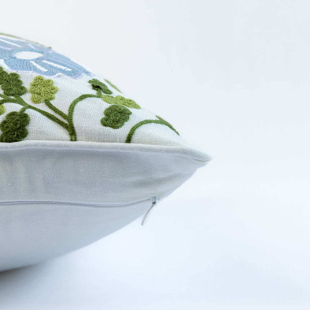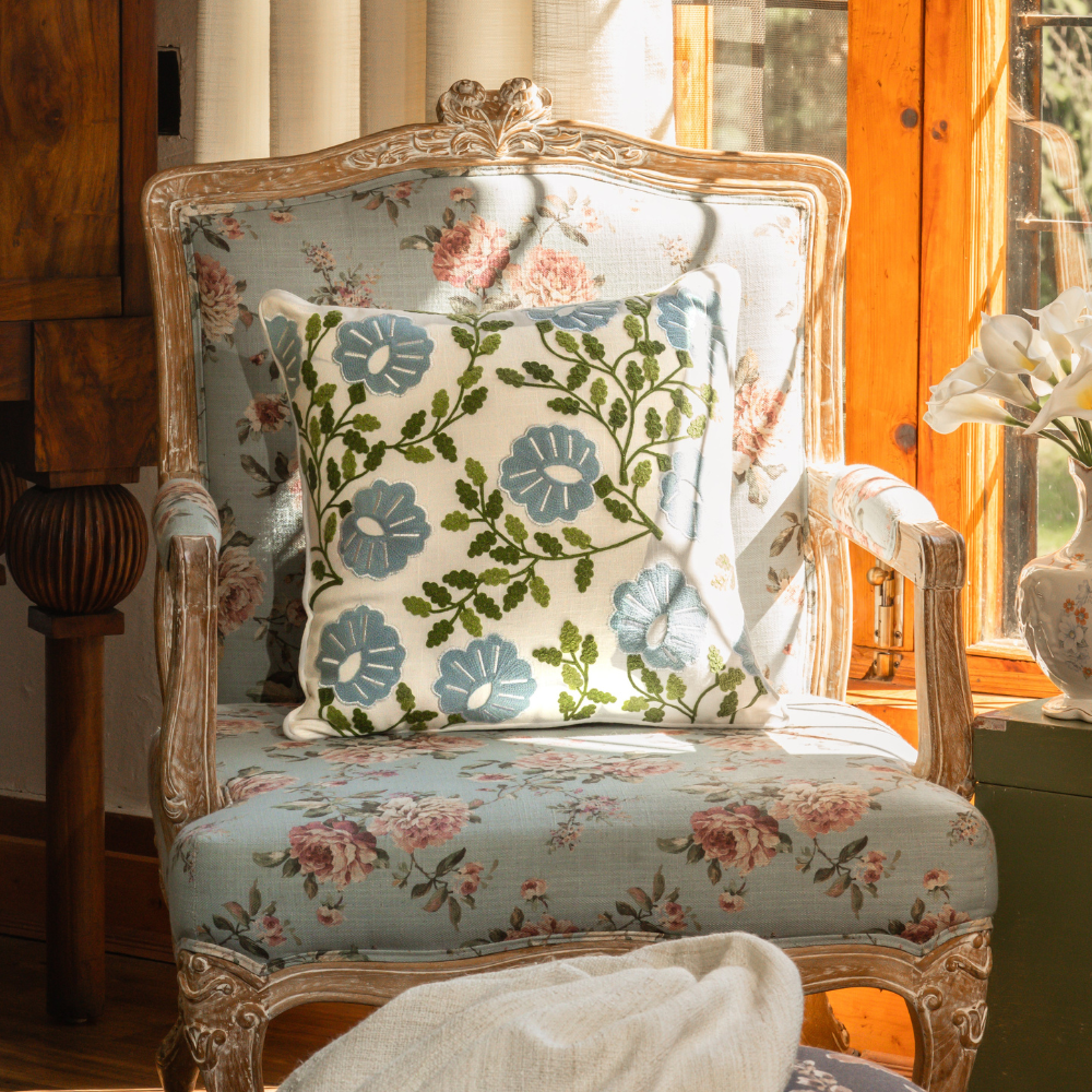 Inspired by the meadows of Kashmir, this delicate country-style cushion cover features crewel embroidery in an intricate jaal pattern. Key Features: • Hand embroidered with intricate detailing for a refined, artisanal touch. • Showcases rich shades of olive and moss green, accented with floral buds in grey and silver hues. • Coordinated finishing enhanced with matching cotton piping for a seamless, polished look. • Designed to complement soft wall colours and floral upholstery, creating a warm and inviting space. • Features an internal cotton lining for added durability and a luxurious feel.