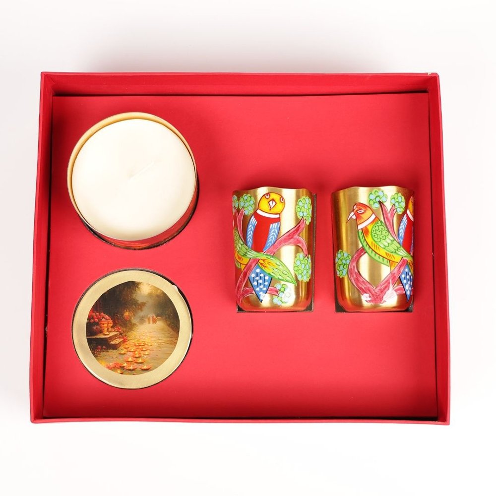 Festive Gift Box (Traditional Pure Brass Tumblers, Brass Coasters, Soy Wax Candle & Playing Cards)