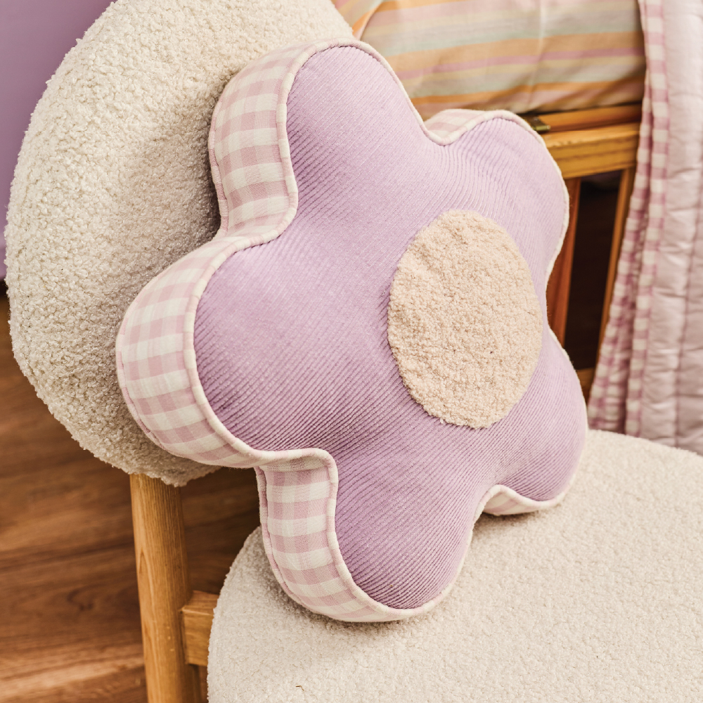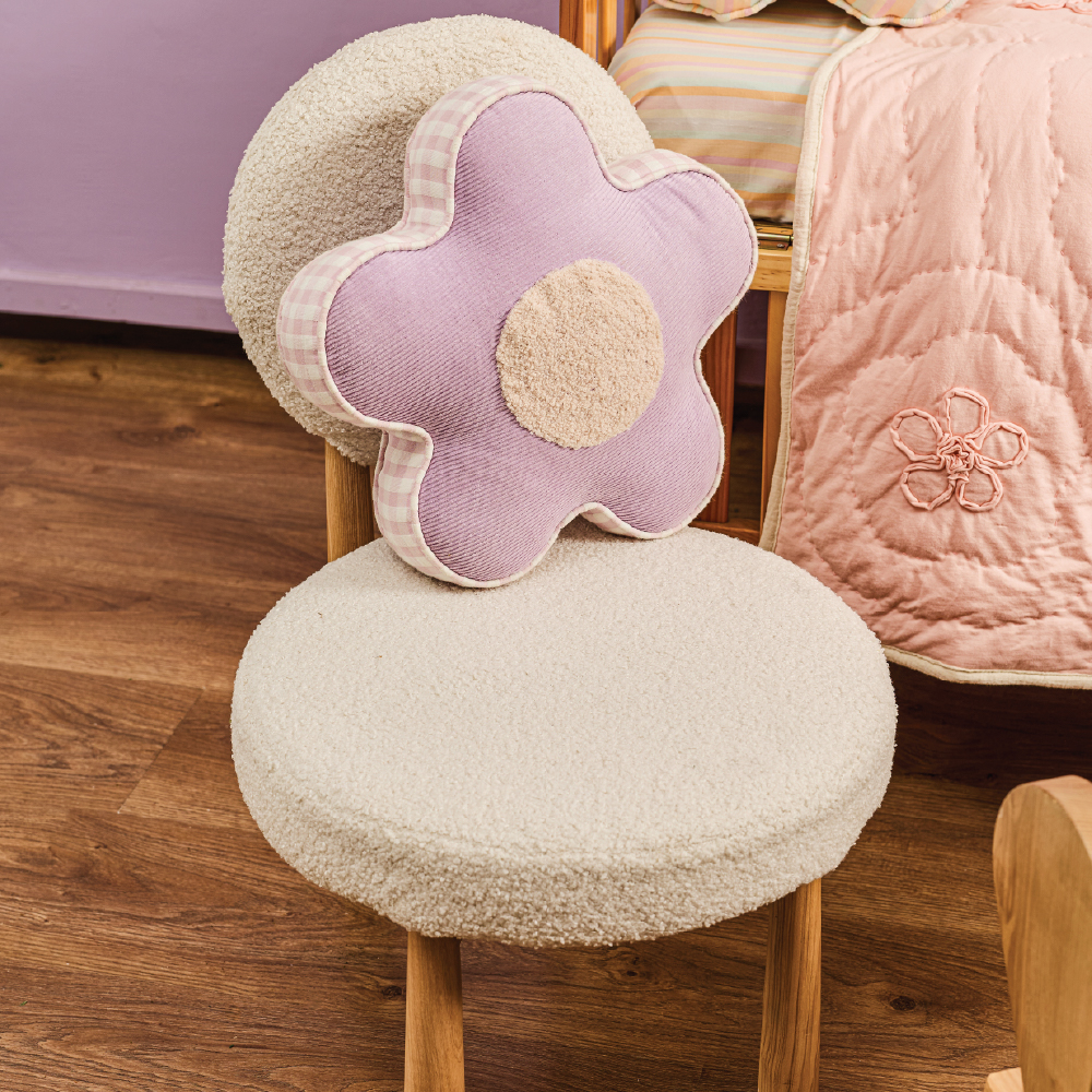 Bright and playful, the Flower Pop Cushion features an animated flower shape inspired by kids’ notebook doodles. Made from cotton-textured fabric for softness and structure, it’s detailed with raised center embroidery in a complementary color and finished with piping along the edges for a clean, polished look.