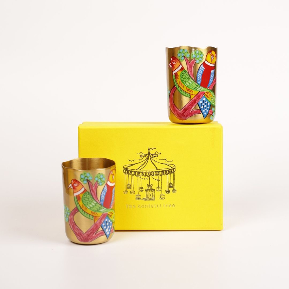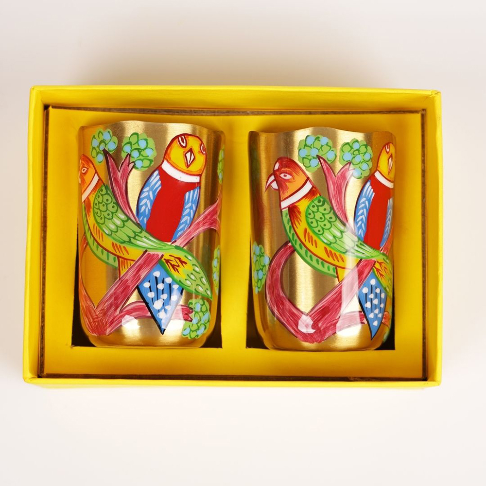 Handpainted Bird Design Pure Brass Tumblers Gift Box (Set of 2)