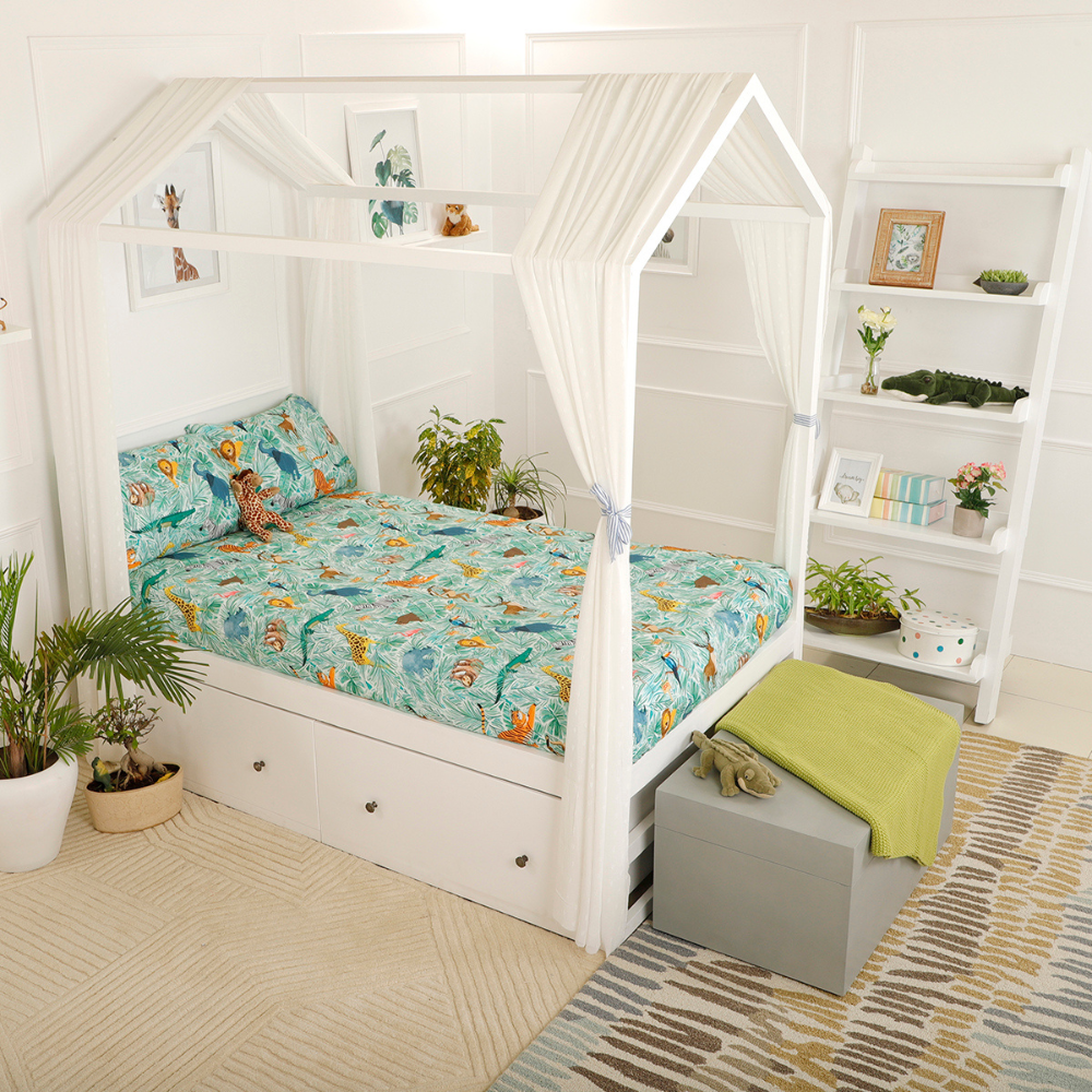 Bring the wild indoors with the Jungle Safari organic cotton bedsheet. Soft, breathable and gentle on the skin.