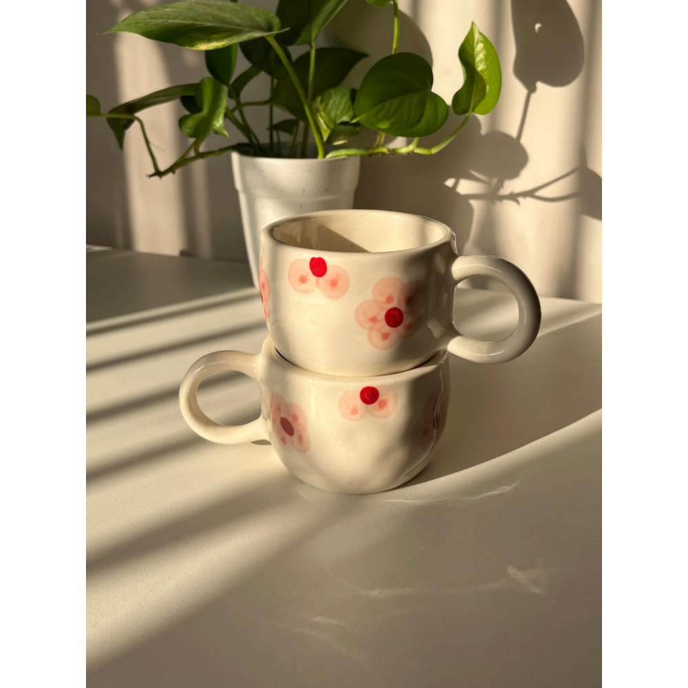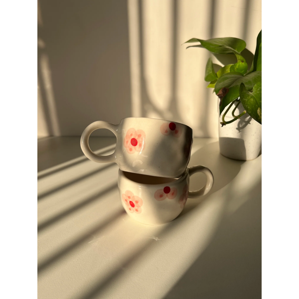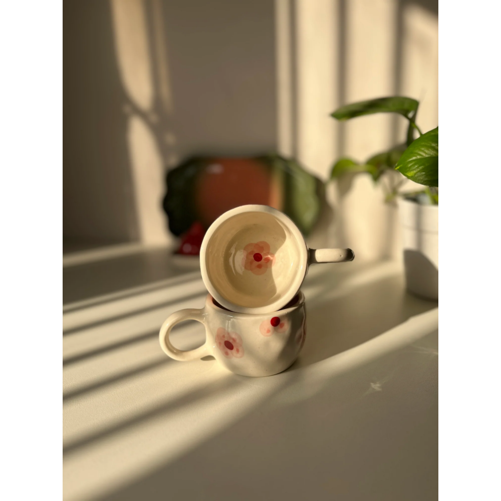 Soft, delicate, and quietly charming, the Little Peony Cup is inspired by the gentle beauty of blooming florals. Crafted in ceramic with a glossy finish, it features hand-painted blush peony motifs with subtle red accents, scattered across a creamy base for a look that feels light and romantic. Its rounded form and comfortable handle make it perfect for slow mornings and easy, everyday use, whether it’s coffee, tea, or something in between