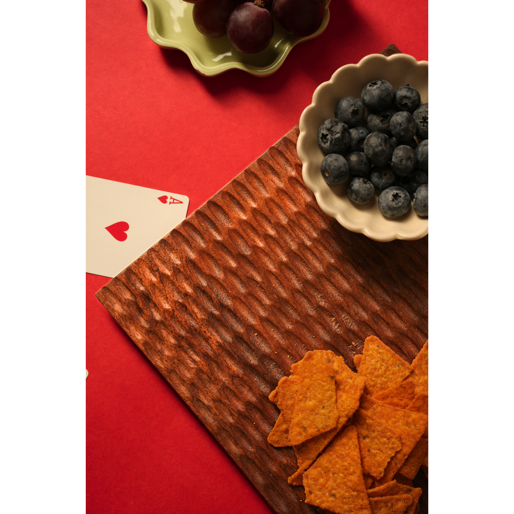 A piece that carries rhythm in its form. The Loom Platter is hand-carved in mango wood with wave-inspired chiseled textures that catch both light and touch. Designed as a 10-inch square, it’s the perfect canvas for serving festive appetisers, styling a charcuterie spread, or creating a fresh fruit display. Lightweight yet sturdy, each platter celebrates the natural grain of mango wood, making no two pieces alike, each one imperfectly perfect.