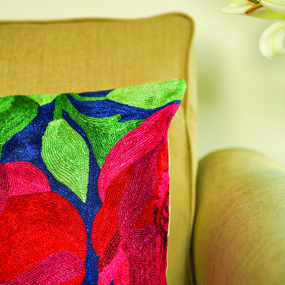An elegant cushion cover with floral pattern hand-embroidered by our talented artisans. The base material is a mill dyed cotton fabric called Dusooti. Silk threads are used to make chainstitches that create floral motifs. Crafted with love and detail exclusively for your space to stand out from rest. All Chaar Chinar products are handcrafted with love. No two products will be exact replicas as variations are natural to the handcrafting process.