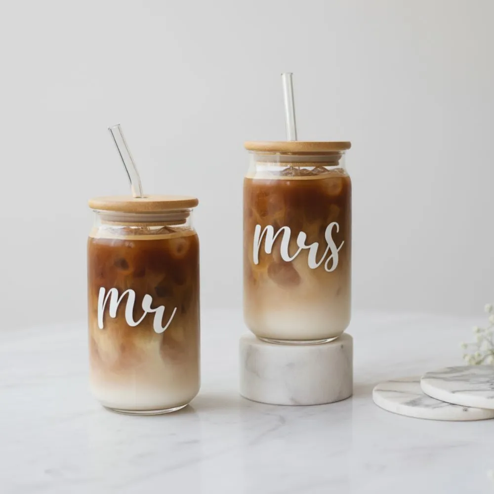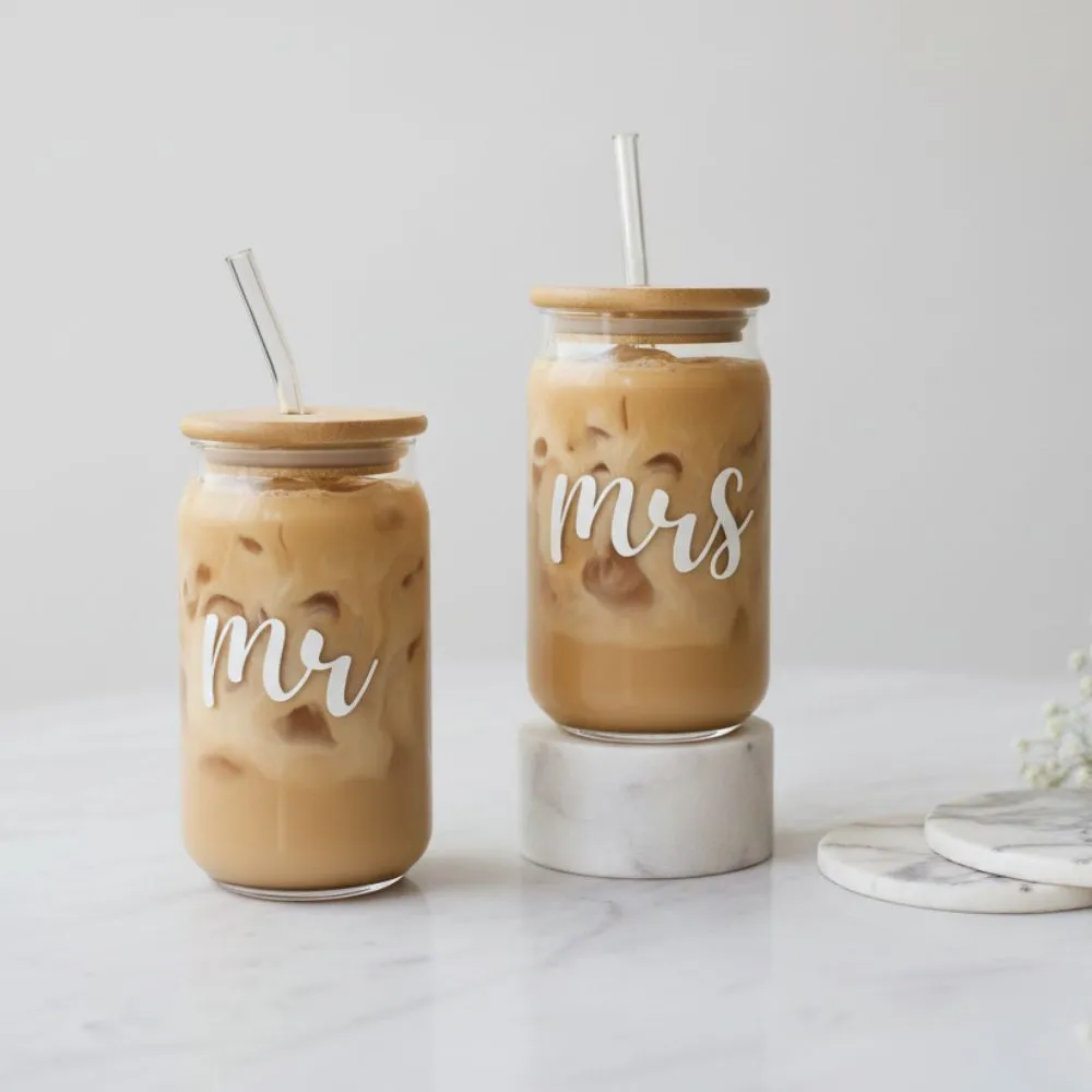Mr and Mrs Glass Tumbler Set with Lid and Straw