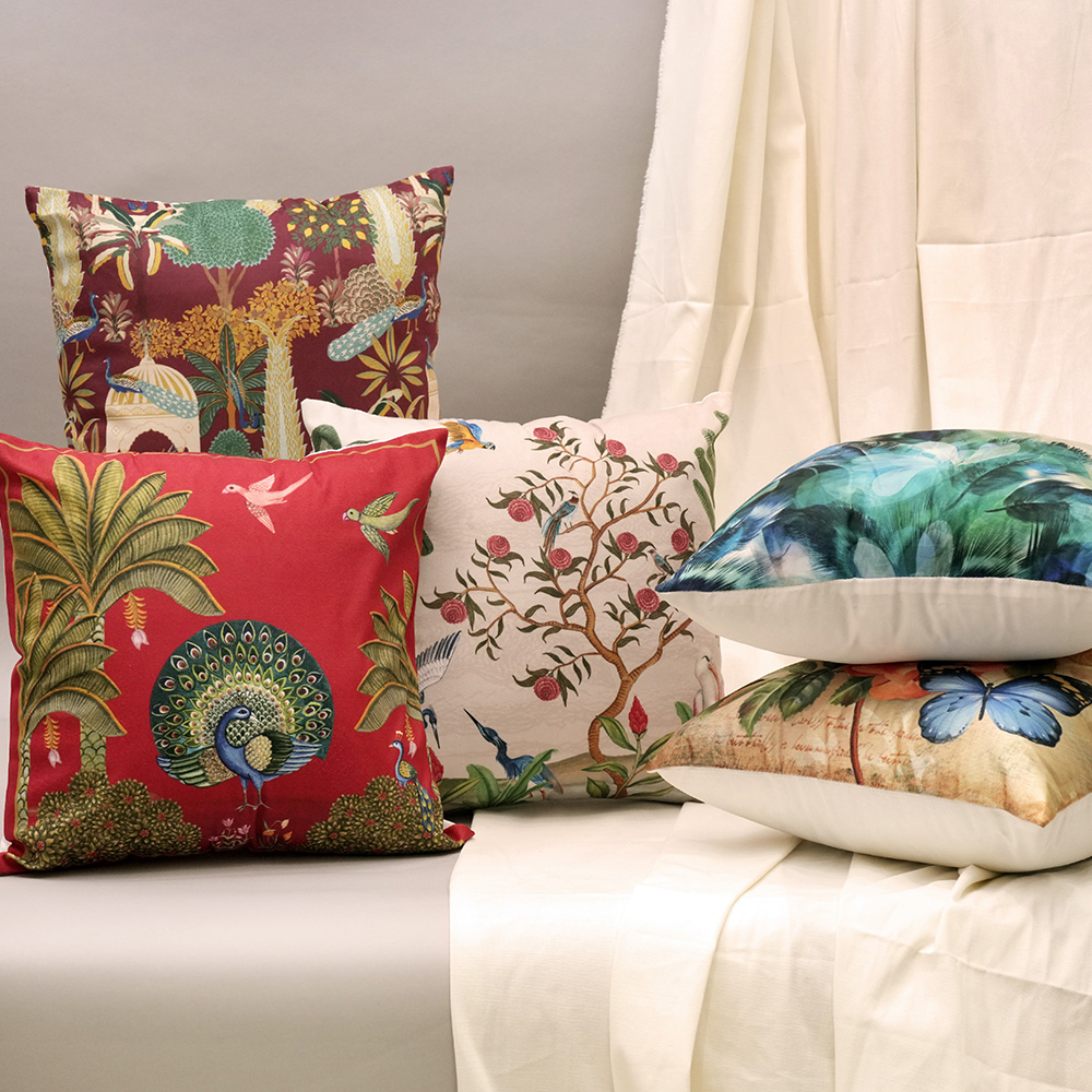 Embrace the spirit of Diwali with our Peacock Paradise Cushion. This luxurious cushion features a rich maroon base, adorned with vibrant prints of peacocks , flowers and palm trees, capturing the essence of elegance and festivity. It provides a plush and comfortable feel, making it perfect for enhancing your home decor during the festive season. Add a touch of tradition and style to your living space with this exquisite cushion, ideal for gifting or as a centerpiece for your Diwali celebrations. Please note: The color of the product may vary depending on the display of your screen.