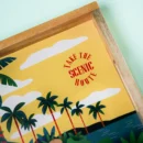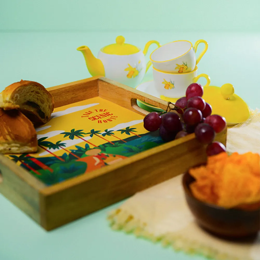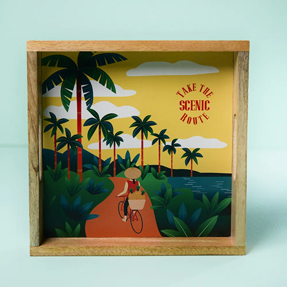 Add a modern twist to your serve ware collection with this Scenic Route Wooden Serving Tray. In a square frame this serving tray features raised edges with handle cut outs for easy carrying. Handcrafted in mango wood the tray is polished with a food grade lacquer and is not suitable for direct washing with water. Please spot clean with a damp cloth on spillage. This tray can also be used as a decorative tray for coffee table settings or can be used as a multi-purpose tray for your creative work space. • Handmade with love in India.
