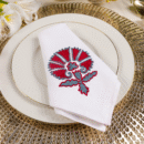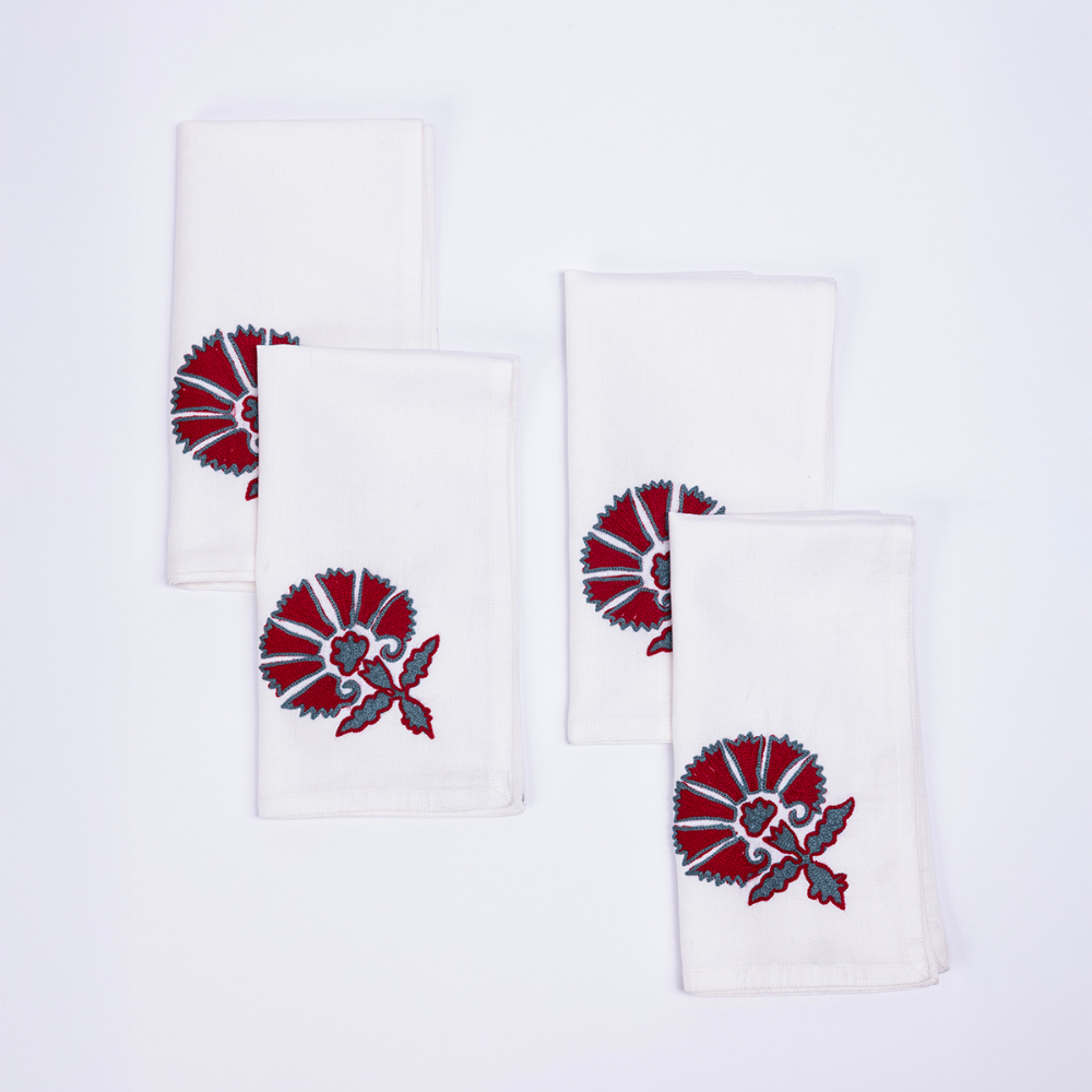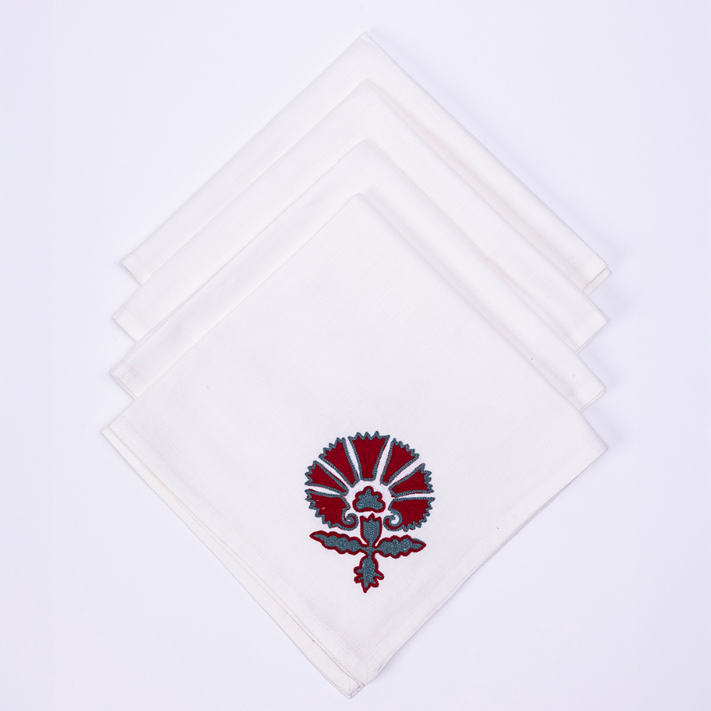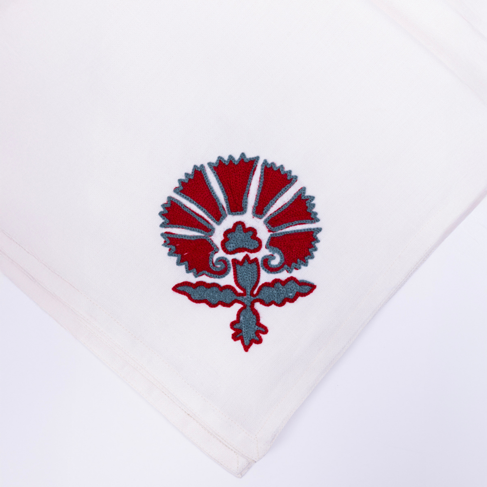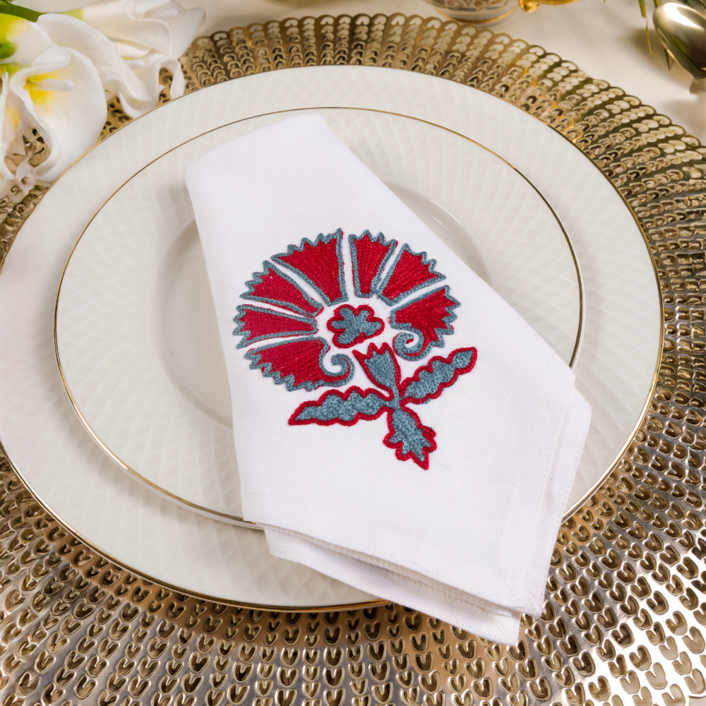 Rooted in the timeless elegance of Kashmiri craftsmanship, the Red Wedlock dinner napkin draws from Suzani-inspired motifs and intricate aari embroidery. This design merges heritage artistry with a contemporary color palette, making it a statement piece for any table.